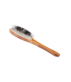 Het zwijnenhaar in de hybride borstel zorgt voor een mooie glanzende vacht. Terwijl je tegelijkertijd de vacht onderhoud met de pinnen die op de borstel zitten. De borstel heeft een 100% bamboe handvat.