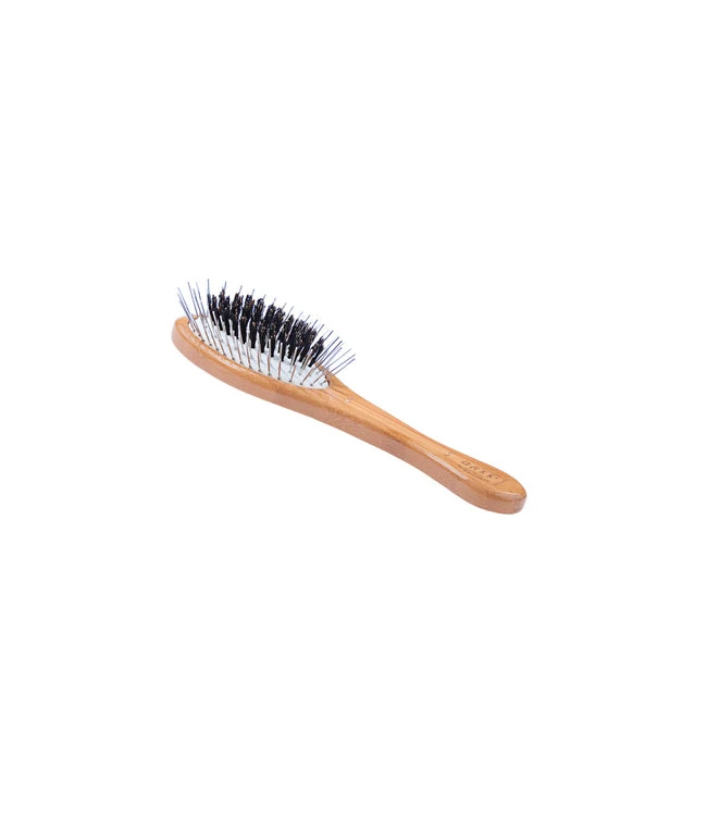 Het zwijnenhaar in de hybride borstel zorgt voor een mooie glanzende vacht. Terwijl je tegelijkertijd de vacht onderhoud met de pinnen die op de borstel zitten. De borstel heeft een 100% bamboe handvat.