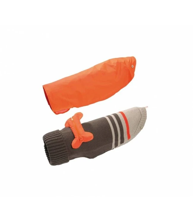 Coltruitje van het merk Bobby . In het oranje bot vormige zakje op de rug zit een regenjasje wat over het truitje gedragen kan worden.