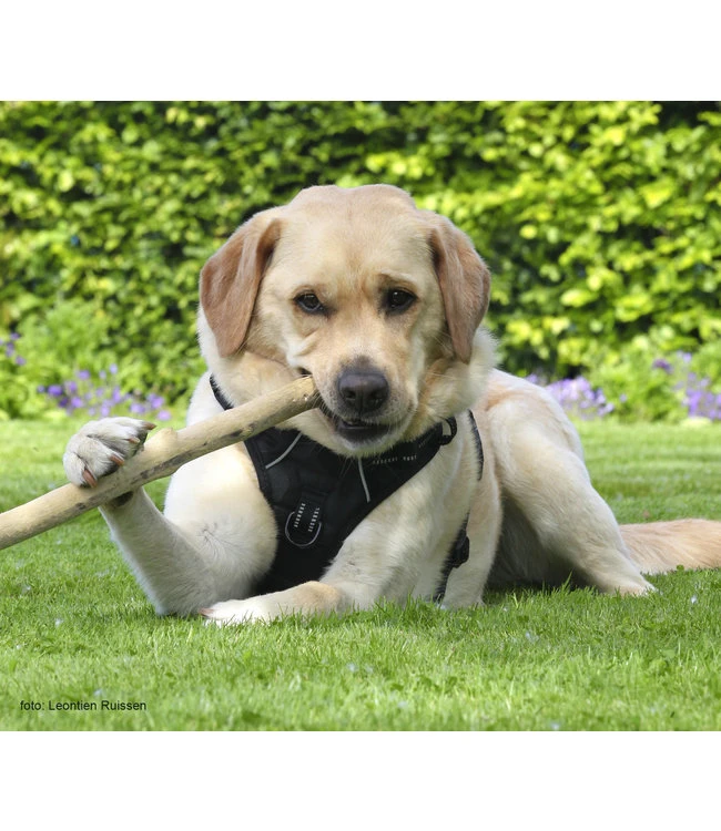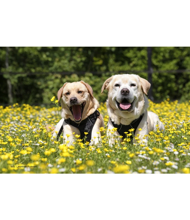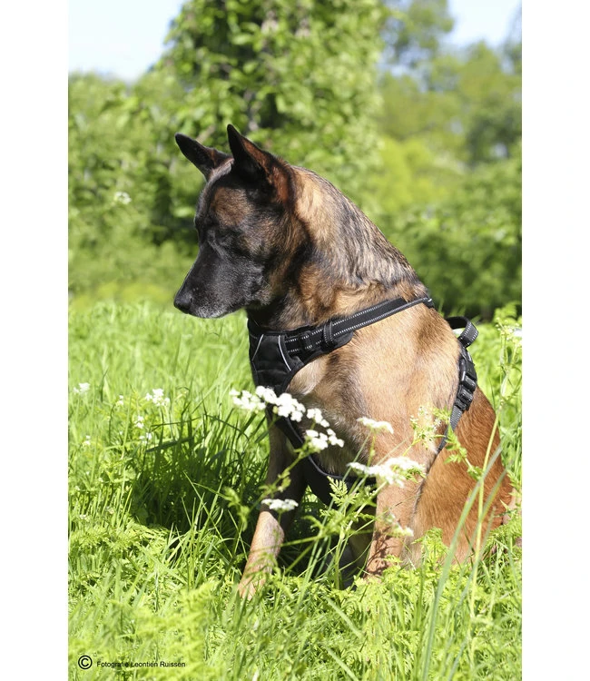 Dit verstelbare harnas heeft 2 handige gespen op de buikriemen en 1 vergrendelbare clip in de nek voor gemakkelijk aan- en uit doen, zonder dat je het over het hoofd van de hond moet doen.