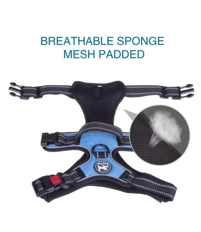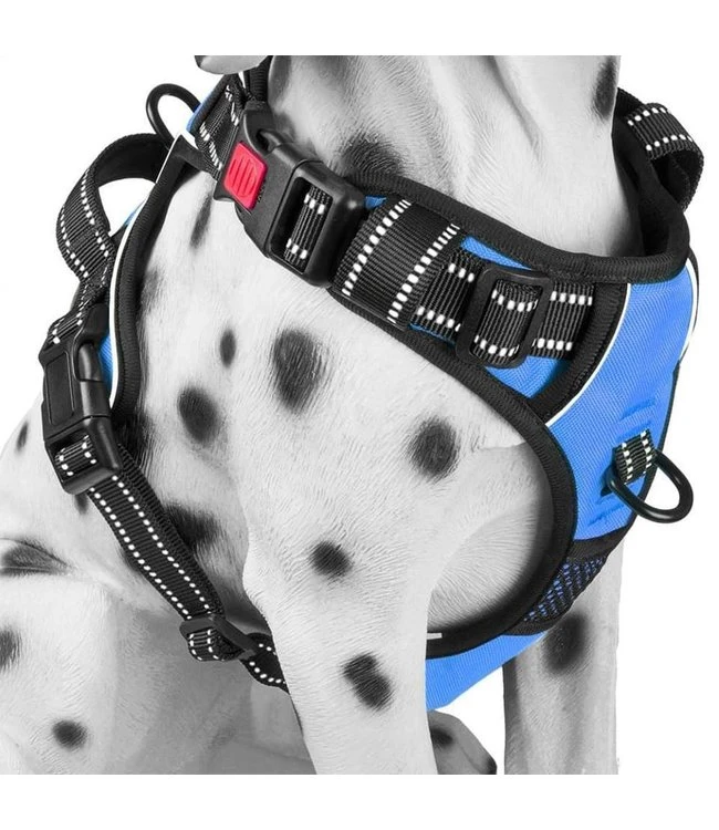 Dit verstelbare harnas heeft 2 handige gespen op de buikriemen en 1 vergrendelbare clip in de nek voor gemakkelijk aan- en uit doen, zonder dat je het over het hoofd van de hond moet doen. Ons no pull hondentuig heeft twee stevige metalen ringen waar de looplijn aan kan bevestigen. Op de bovenkant van het tuig zit een stevige metalen ring, en aan de voorkant van het tuig zit ook een ring, welke te gebruiken is voor honden die hard aan de lijn trekken. Het hondentuig is zacht ademend met mesh stof, de trekdruk wordt gelijkmatig over het lichaam verdeeld om verstikking te voorkomen. Dit stevige hondenharnas is perfect voor dagelijks wandelen, hardlopen, trainen, jagen, buitenavonturen en nog veel meer!