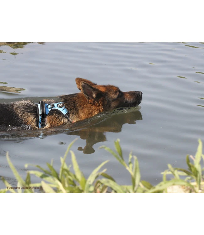 Dit verstelbare harnas heeft 2 handige gespen op de buikriemen en 1 vergrendelbare clip in de nek voor gemakkelijk aan- en uit doen, zonder dat je het over het hoofd van de hond moet doen.