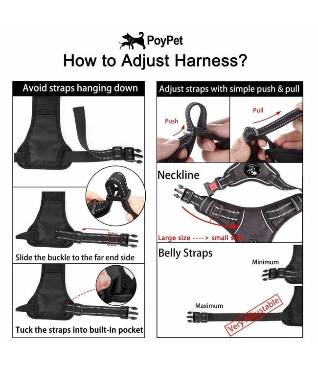 Dit verstelbare harnas heeft 2 handige gespen op de buikriemen en 1 vergrendelbare clip in de nek voor gemakkelijk aan- en uit doen, zonder dat je het over het hoofd van de hond moet doen. Ons no pull hondentuig heeft twee stevige metalen ringen waar de looplijn aan kan bevestigen. Op de bovenkant van het tuig zit een stevige metalen ring, en aan de voorkant van het tuig zit ook een ring, welke te gebruiken is voor honden die hard aan de lijn trekken. Het hondentuig is zacht ademend met mesh stof, de trekdruk wordt gelijkmatig over het lichaam verdeeld om verstikking te voorkomen. Dit stevige hondenharnas is perfect voor dagelijks wandelen, hardlopen, trainen, jagen, buitenavonturen en nog veel meer!