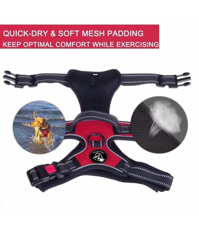 Dit verstelbare harnas heeft 2 handige gespen op de buikriemen en 1 vergrendelbare clip in de nek voor gemakkelijk aan- en uit doen, zonder dat je het over het hoofd van de hond moet doen. Ons no pull hondentuig heeft twee stevige metalen ringen waar de looplijn aan kan bevestigen. Op de bovenkant van het tuig zit een stevige metalen ring, en aan de voorkant van het tuig zit ook een ring, welke te gebruiken is voor honden die hard aan de lijn trekken. Het hondentuig is zacht ademend met mesh stof, de trekdruk wordt gelijkmatig over het lichaam verdeeld om verstikking te voorkomen. Dit stevige hondenharnas is perfect voor dagelijks wandelen, hardlopen, trainen, jagen, buitenavonturen en nog veel meer!