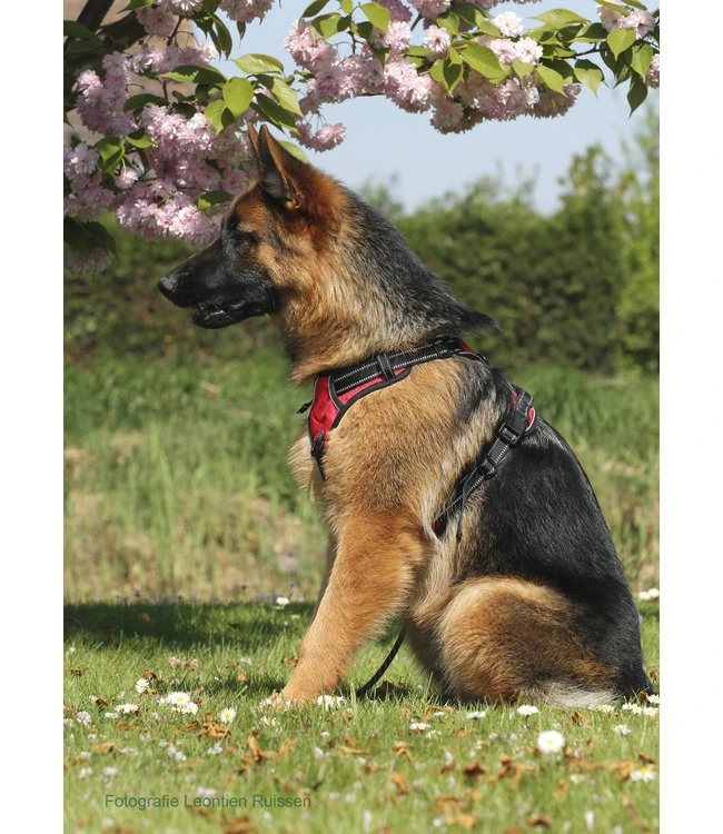 Dit verstelbare harnas heeft 2 handige gespen op de buikriemen en 1 vergrendelbare clip in de nek voor gemakkelijk aan- en uit doen, zonder dat je het over het hoofd van de hond moet doen.