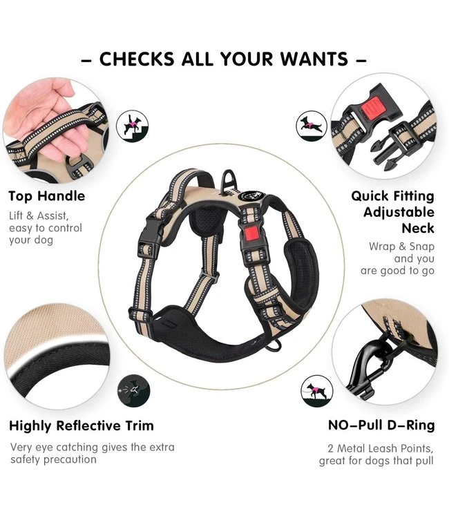 Dit verstelbare harnas heeft 2 handige gespen op de buikriemen en 1 vergrendelbare clip in de nek voor gemakkelijk aan- en uit doen, zonder dat je het over het hoofd van de hond moet doen. Ons no pull hondentuig heeft twee stevige metalen ringen waar de looplijn aan kan bevestigen. Op de bovenkant van het tuig zit een stevige metalen ring, en aan de voorkant van het tuig zit ook een ring, welke te gebruiken is voor honden die hard aan de lijn trekken. Het hondentuig is zacht ademend met mesh stof, de trekdruk wordt gelijkmatig over het lichaam verdeeld om verstikking te voorkomen. Dit stevige hondenharnas is perfect voor dagelijks wandelen, hardlopen, trainen, jagen, buitenavonturen en nog veel meer!