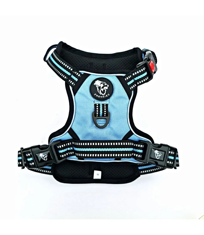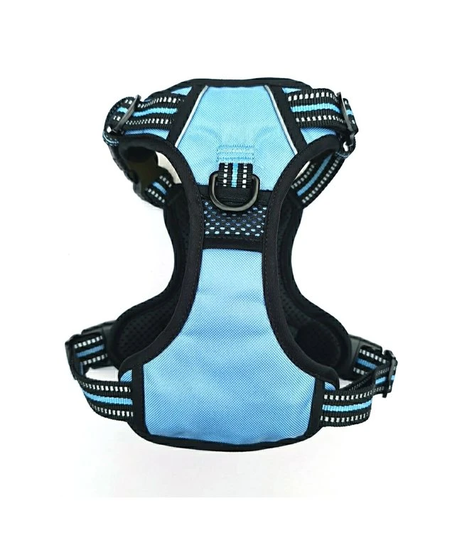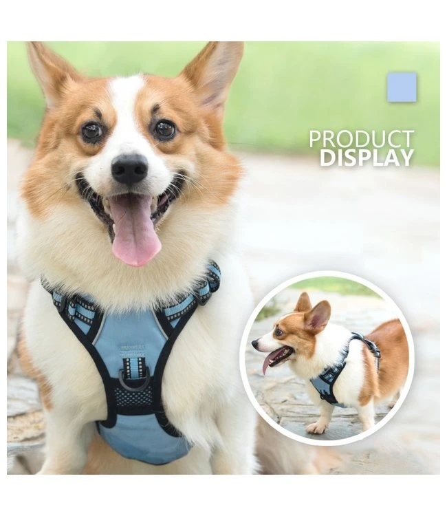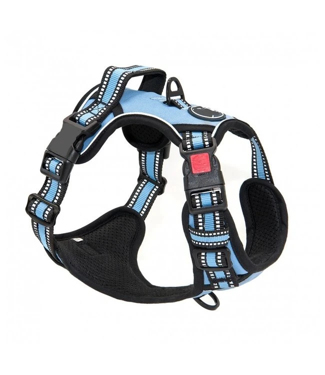 Dit verstelbare harnas heeft 2 handige gespen op de buikriemen en 1 vergrendelbare clip in de nek voor gemakkelijk aan- en uit doen, zonder dat je het over het hoofd van de hond moet doen. Ons no pull hondentuig heeft twee stevige metalen ringen waar de looplijn aan kan bevestigen. Op de bovenkant van het tuig zit een stevige metalen ring, en aan de voorkant van het tuig zit ook een ring, welke te gebruiken is voor honden die hard aan de lijn trekken. Het hondentuig is zacht ademend met mesh stof, de trekdruk wordt gelijkmatig over het lichaam verdeeld om verstikking te voorkomen. Dit stevige hondenharnas is perfect voor dagelijks wandelen, hardlopen, trainen, jagen, buitenavonturen en nog veel meer!