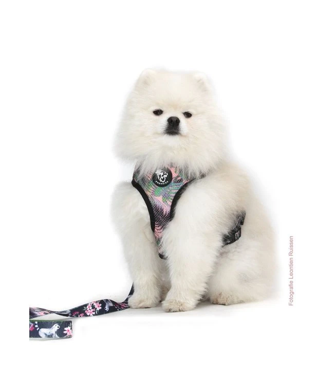Vergeet niet om de bijpassende lijn, bandana, halsband of autogordel bij dit tuigje te bestellen