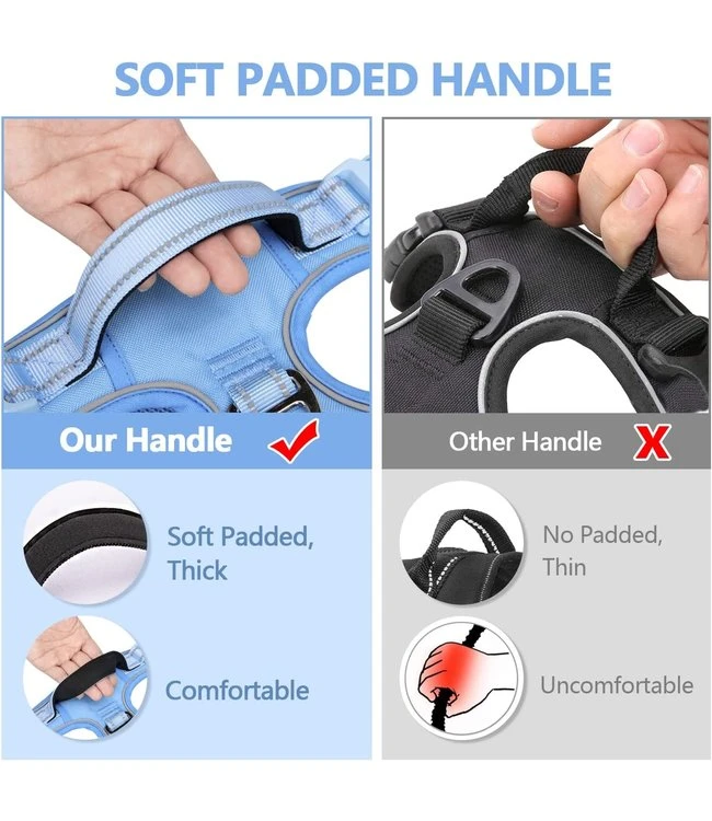 Gevoerde en comfortabele handgreep boven op het tuig, zachte voering zorgt voor een handvat dat goed voelt in de hand voor extra controle om uw hond te begeleiden. Het werkt ook als autogordellus. Reflecterend stiksel met groot oppervlak voor gebruik ’s nachts voor extra zichtbaarheid. Lichtgewicht en duurzaam, ontworpen met minimale massa voor maximale vingergevoeligheid. 3 manieren verstelbare bandjes, het tuig is volledig te verstellen en aan te passen met ruimte voor groei.