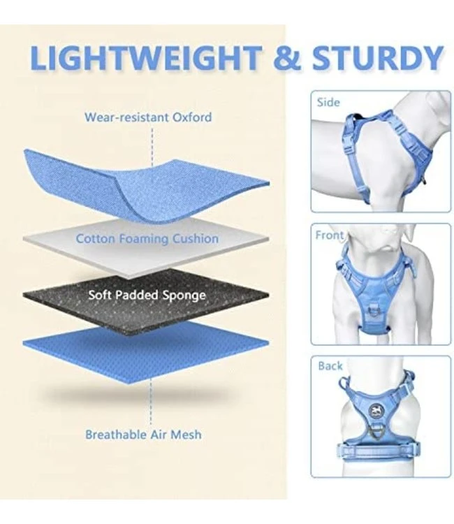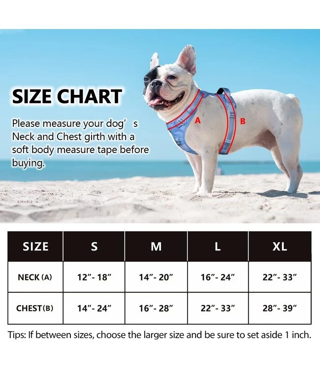 Dit verstelbare harnas heeft 2 handige gespen op de buikriemen en 1 vergrendelbare clip in de nek voor gemakkelijk aan- en uit doen, zonder dat je het over het hoofd van de hond moet doen. Onze frenkiez no pull hondentuigen hebben twee stevige metalen ringen waar je de looplijn aan kan bevestigen. Op de bovenkant van het tuig zit een stevige metalen ring, en aan de voorkant van het tuig zit ook een ring, welke te gebruiken is voor honden die hard aan de lijn trekken. Het hondentuig is zacht ademend met mesh stof, de trekdruk wordt gelijkmatig over het lichaam verdeeld om verstikking te voorkomen. Dit stevige hondenharnas is perfect voor dagelijks wandelen, hardlopen, trainen, jagen, buitenavonturen en nog veel meer!