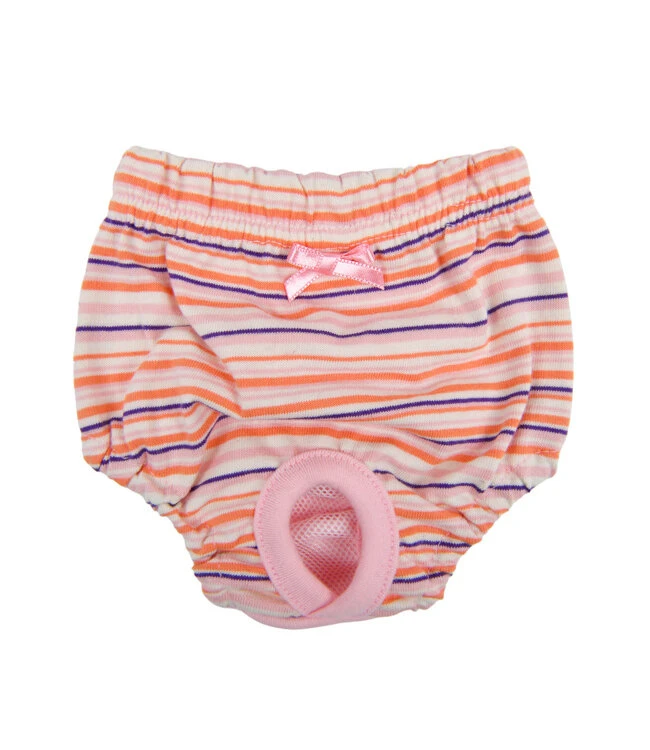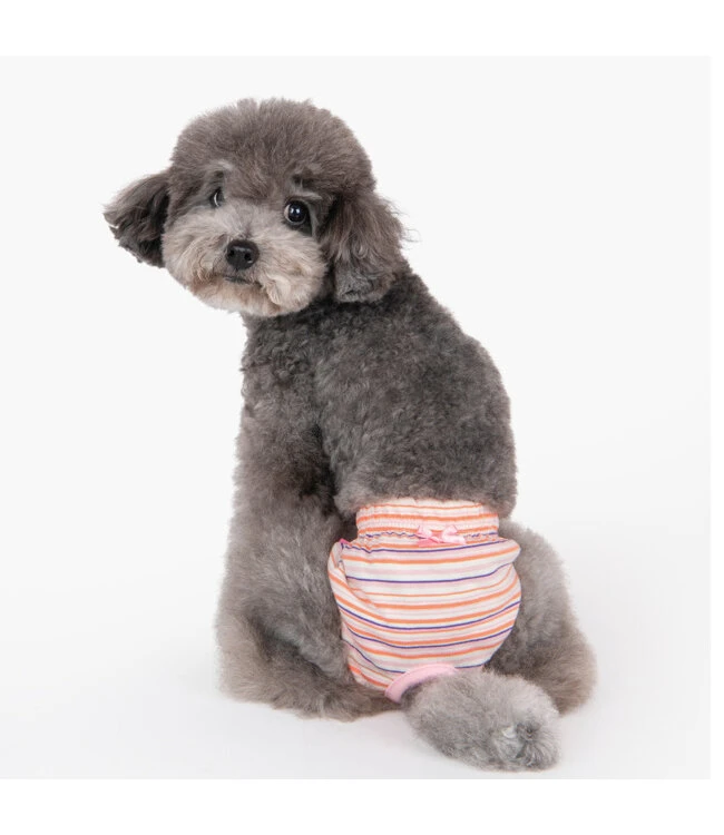Dit zachte loopsheidbroekje van katoen is de Meline sanitary pants van Pinkaholic. Een periodebroekje wat door zijn fijne pasvorm goed aansluit bij de hond . Het loopsheidbroekje is gemaakt van zachte ademende stof. Het broekje is geschikt voor kleine hondenrassen. In het broekje zit een ruimte waar u een op maat geknipt maandverbandje in kunt plaatsen. De taille sluit door het elastiek goed aan, en aan de bovenzijde is er een gat voor de staart.