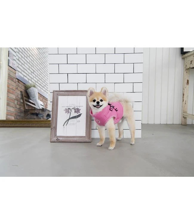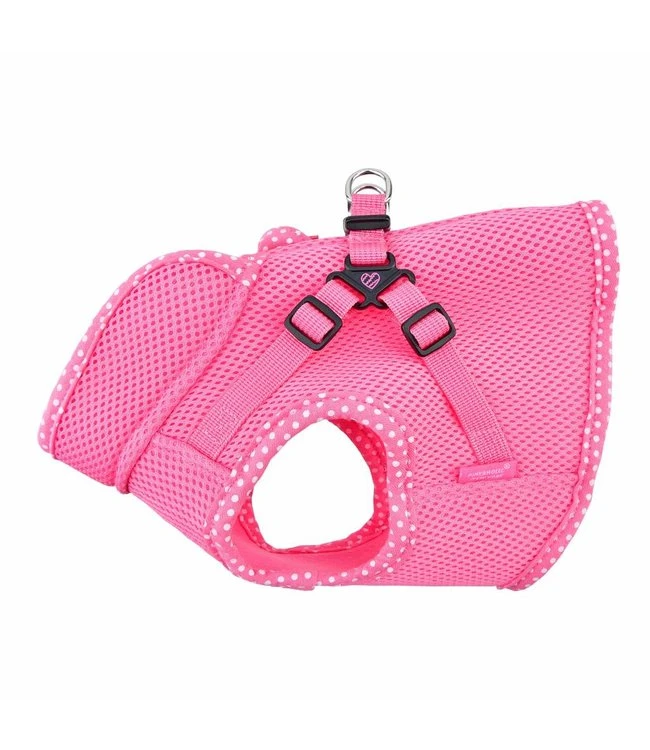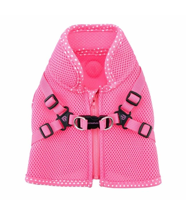Dit zachte tuigje van polyester is het Niki Harness van Pinkaholic. Een tuigje wat door zijn fijne pasvorm goed aansluit bij de hond. Het harnas is gemaakt van airmesh materiaal. Dit maakt het tuig luchtdoorlatend en ook geschikt voor warmere dagen.Het harnas is geschikt voor de kleinere hondenrassen . U kunt het Pinkaholic Niki Harness met behulp van de nylon bandjes op de rug passend maken voor uw hond. Aan de bovenzijde van het tuigje bevindt zich een D-ring waaraan u de lijn aan kunt bevestigen. Bij tuigjes van model B is het belangrijk dat u de omvang achter de voorpootjes goed op meet. De tuigjes zijn maar een aantal cm te verstellen en gaan niet over het hoofd heen.