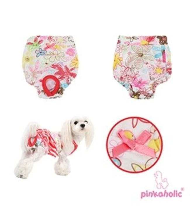 Dit zachte loopsheidbroekje van katoen is de picnic sanitary pants van Pinkaholic. Een periodebroekje wat door zijn fijne pasvorm goed aansluit bij de hond . Het loopsheidbroekje is gemaakt van zachte ademende stof. Het broekje is geschikt voor kleine hondenrassen. In het broekje zit een ruimte waar u een op maat geknipt maandverbandje in kunt plaatsen. De taille sluit door het elastiek goed aan, en aan de bovenzijde is er een gat voor de staart.