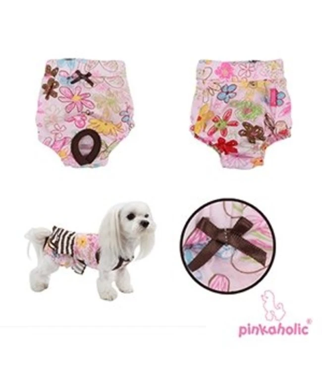 Dit zachte loopsheidbroekje van katoen is de picnic sanitary pants van Pinkaholic. Een periodebroekje wat door zijn fijne pasvorm goed aansluit bij de hond . Het loopsheidbroekje is gemaakt van zachte ademende stof. Het broekje is geschikt voor kleine hondenrassen. In het broekje zit een ruimte waar u een op maat geknipt maandverbandje in kunt plaatsen. De taille sluit door het elastiek goed aan, en aan de bovenzijde is er een gat voor de staart.