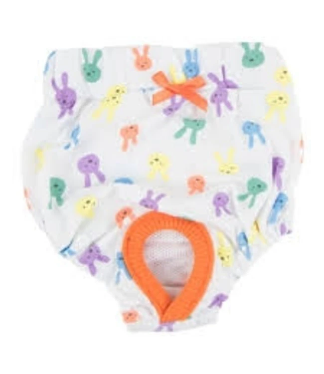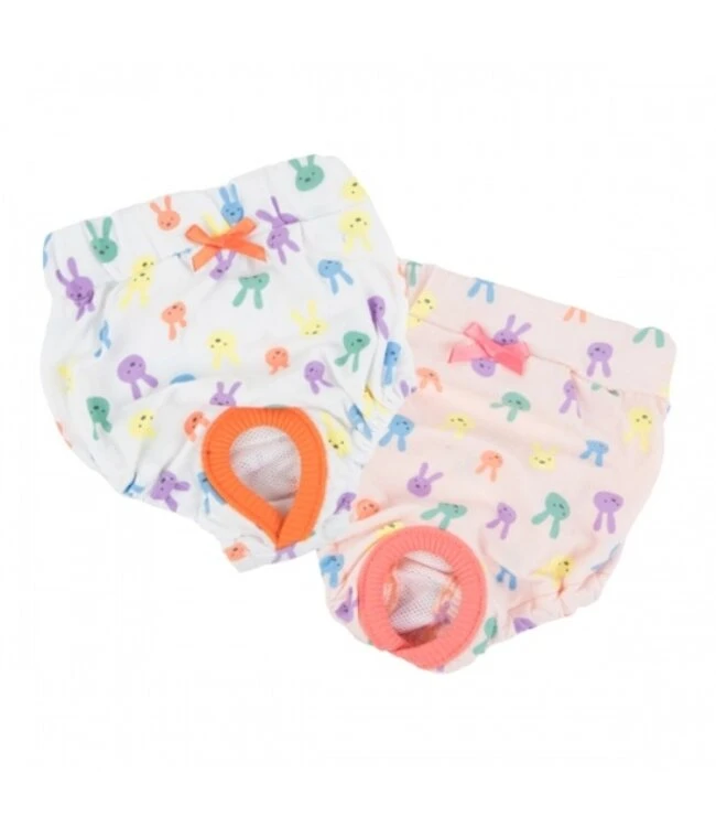 Dit zachte loopsheidbroekje van katoen is de baby bunny sanitary pants van Pinkaholic. Een periodebroekje wat door zijn fijne pasvorm goed aansluit bij de hond . Het loopsheidbroekje is gemaakt van zachte ademende stof. Het broekje is geschikt voor kleine hondenrassen. In het broekje zit een ruimte waar u een op maat geknipt maandverbandje in kunt plaatsen. De taille sluit door het elastiek goed aan, en aan de bovenzijde is er een gat voor de staart.