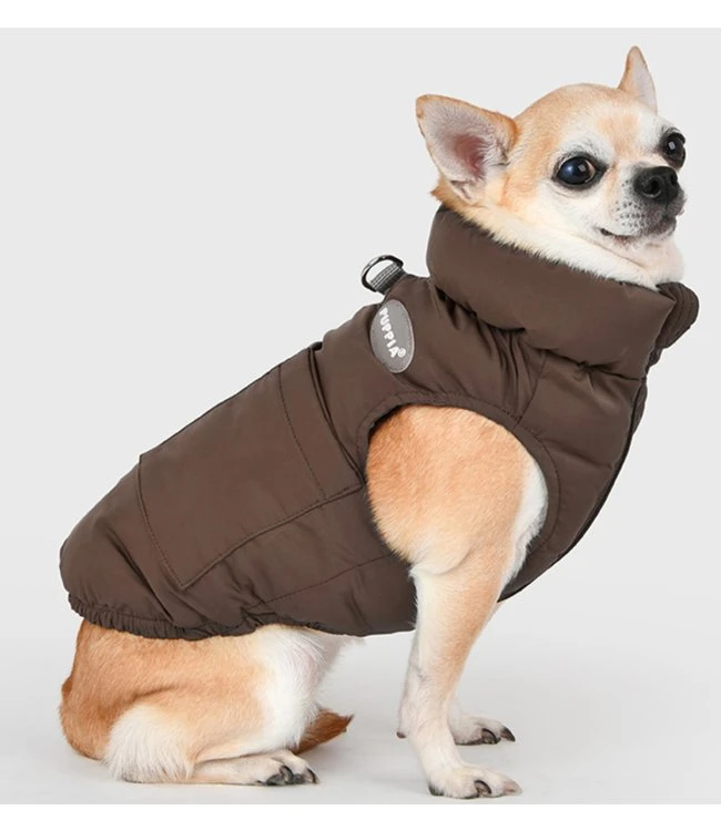 Dit waterproof jasje van Nylon is de Puffer Vest Jumper van Puppia. Een jasje wat door zijn fijne pasvorm goed aansluit bij de hond. Het hondenjasje is gemaakt van soepelvallende gevoerde stof. Dit maakt de hondenjas heerlijk warm en dus geschikt voor in de winter. Het jasje is geschikt voor de wat kleinere en middelgrote hondenrassen. U kunt de Puppia Puffer Vest Jumper aan de onderkant sluiten door middel van een rits. Wat een voordeel van dit hondenjasje is, is dat het ook direct als tuigje gebruikt kan worden. Aan de bovenzijde van het jasje bevindt zich een D-ring waaraan u de lijn aan kunt bevestigen.