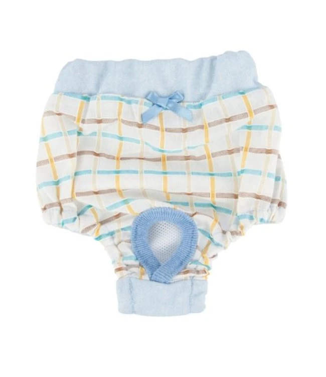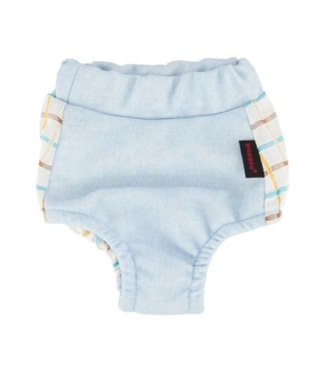Dit zachte loopsheidbroekje van katoen is de Tot sanitary pants van Puppia. Een periodebroekje wat door zijn fijne pasvorm goed aansluit bij de hond . Het loopsheidbroekje is gemaakt van zachte ademende stof. Het broekje is geschikt voor kleine hondenrassen. In het broekje zit een ruimte waar u een op maat geknipt maandverbandje in kunt plaatsen. De taille sluit door het elastiek goed aan, en aan de bovenzijde is er een gat voor de staart.